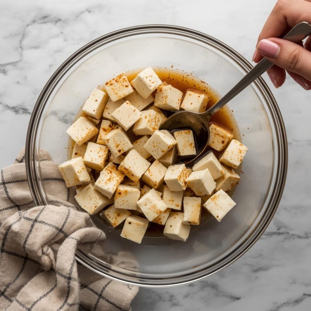 - In a bowl, toss the tofu with oil and soy sauce. Then coat evenly with cornstarch and spices. Shake well to ensure each piece is fully coated.