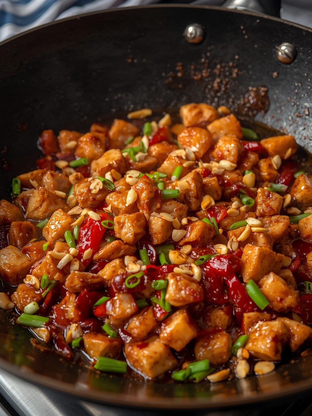 6. Stir the sauce again and pour it into the wok. Stir-fry until the sauce thickens and becomes glossy, then stir in the peanuts. Serve immediately over cooked rice.